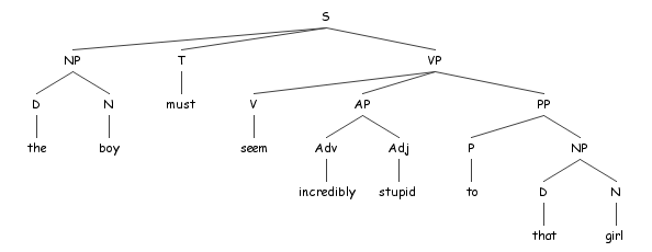 [S [NP [D the] [N boy] ] [T must ] [VP [V seem ][AP [Adv incredibly ] [Adj stupid ] ] [PP [P to ] [NP [D that ] [N girl ] ] ] ]]